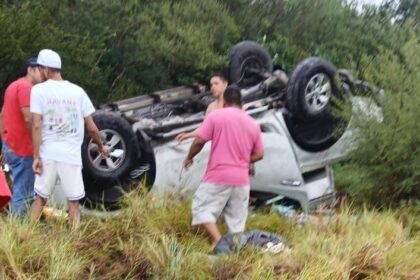 Se trata de una vagoneta tipo miniván de la marca Hyundai en color blanca, que terminó con daños materiales de consideración, tras haber salido de la carretera y terminar volcada.
