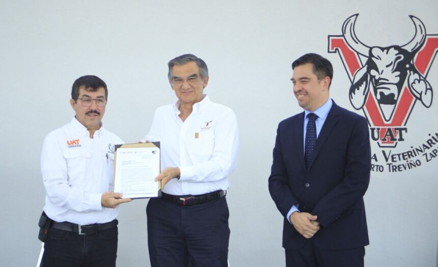 Acompañado por el rector de la UAT, Dámaso Anaya Alvarado, y dirigentes del sector ganadero del estado, el gobernador recibió de manos de Leandro David Soriano García, director general de Inocuidad Agroalimentaria, Acuícola y Pesquera del Senasica, el documento que permite la actividad diaria de la sala de corte y deshuese para la especie bovina, cámara de producto terminado, almacén, empaque y andenes de carga y descarga en el rastro ubicado en la Facultad de Medicina Veterinaria y Zootecnia, en esta capital.
