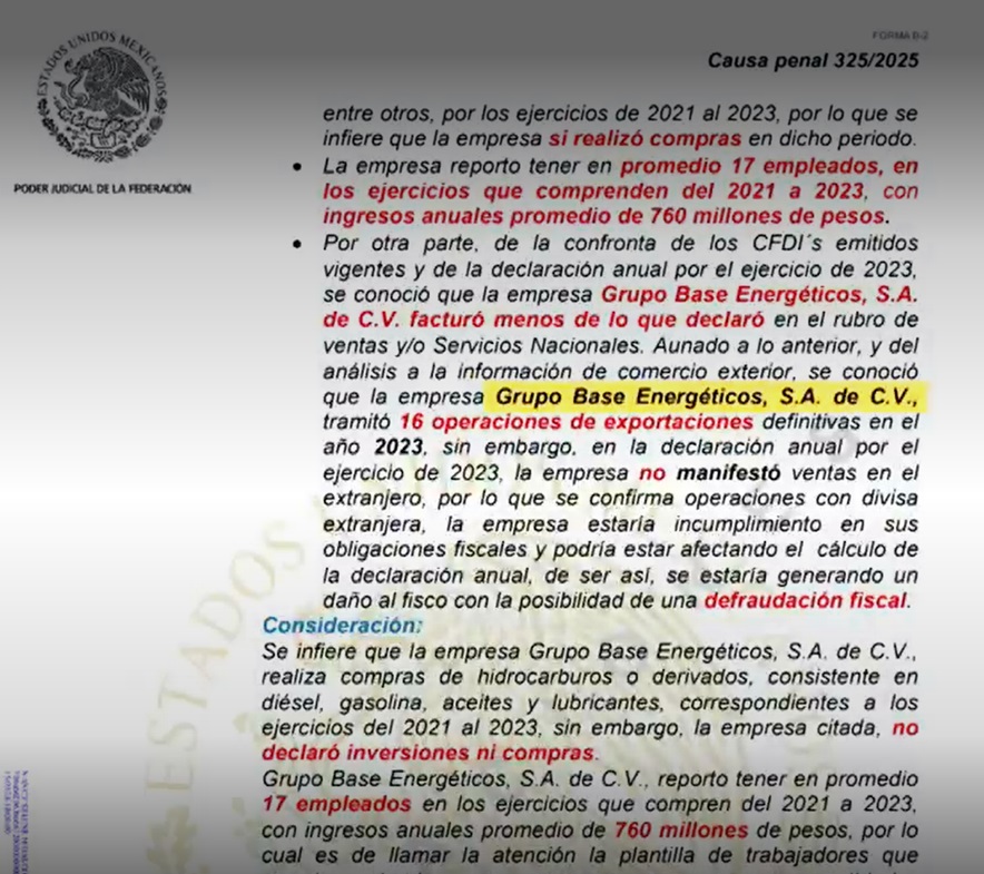 Según la causa penal 325/2025 integrado por la FGR después de un análisis integral del Centro Federal de Inteligencia Criminal se descubrió que “Grupo Base Energéticos” reportó tener en promedio 17 empleados, en los ejercicios que comprenden del 2021 a 2023, con ingresos anuales promedio de 760 millones de pesos.