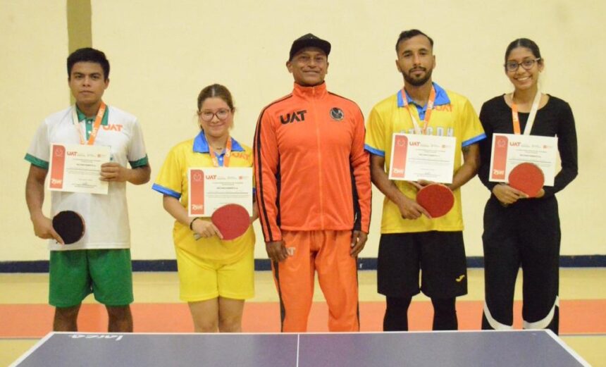 CIUDAD VICTORIA. —Las Abejas de la Unidad Académica de Trabajo Social y Ciencias para el Desarrollo Humano, conquistaron la disciplina de tenis de mesa dentro de los Juegos Deportivos Interfacultades Zona Centro 2025, de la Universidad Autónoma de Tamaulipas, en las ramas varonil y femenil.