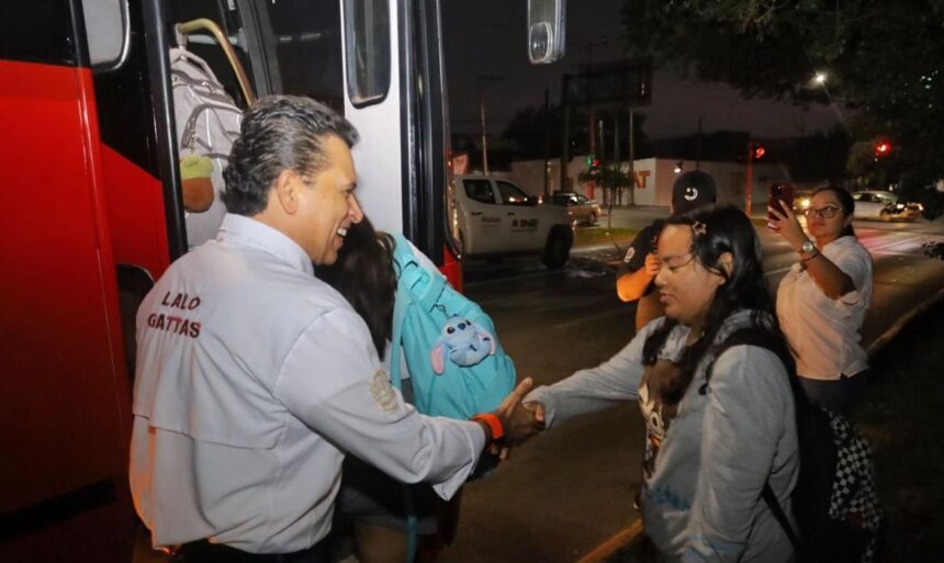 A temprana hora, el alcalde de Victoria Eduardo Gattás Báez, junto a los dirigentes del Instituto Victorense de la Juventud Abraham Gattás Rodríguez y Benjamín Martínez Ramos, recibieron a las y los jóvenes de nivel medio superior que abordaron el viaje inaugural.