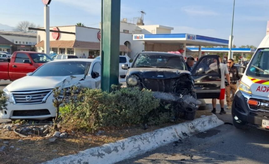 El percance ocurrió la tarde de este miércoles presuntamente cuando uno de los conductores omitió la luz roja del semáforo, provocando el impacto entre un automóvil Nissan Sentra y una camioneta Jeep Liberty. Tras la colisión, esta última unidad se proyectó contra un poste metálico que sostiene el semáforo, lo que agravó los daños en el lugar.