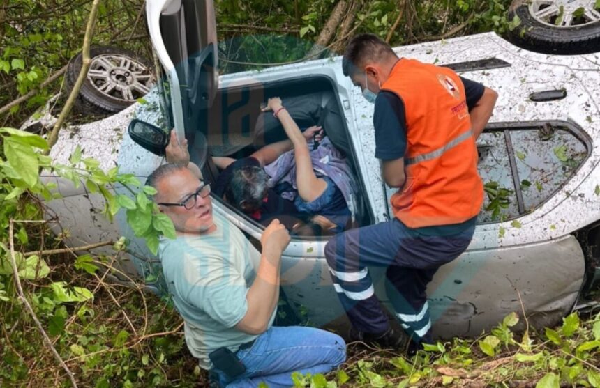 EL MANTE, Tamaulipas. —Un hombre y una mujer resultaron lesionados y quedaron atrapados dentro de su vehículo tras volcar la mañana de este miércoles sobre la carretera Mante–Llera, a la altura del ejido El Encino.
